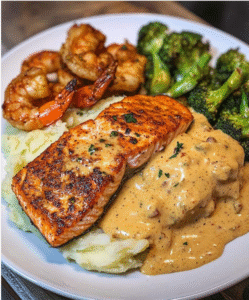 Cajun Salmon with Garlic Mash & Shrimp Veggie Medley 🐟🥦