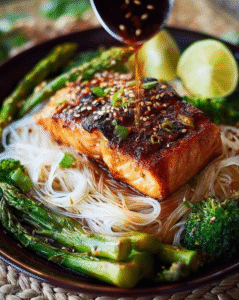 🍯Honey Sesame Salmon with Rice Noodles & Roasted Veggies🍣🍜