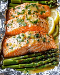 Baked Salmon in Foil with Asparagus & Lemon Garlic Butter Sauce — perfect for a healthy dinner with minimal cleanup!