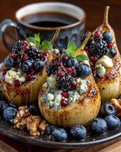 Honey-Roasted Pears Stuffed with Blue Cheese, Berries & Pomegranate, topped with balsamic glaze, walnuts, and fresh mint. 🍐💙🫐✨