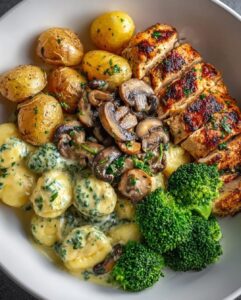 Plate It Up: Serve the gnocchi with the creamy herb sauce, then top with sliced chicken, mushrooms, roasted potatoes, and steamed broccoli.