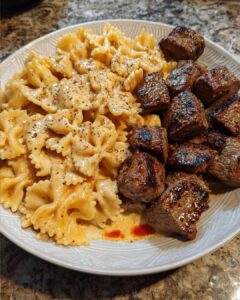 🍽️ Cajun Steak Tips in Cheesy Parmesan Bowtie Pasta 🍝