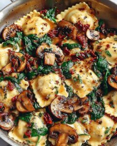 Cheesy Ravioli with Spinach, Mushrooms & Sun-Dried Tomatoes 🍅 🍄🟫
