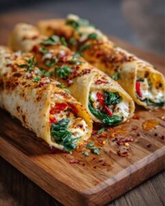 4️⃣ While the feta is baking, prepare the tortillas by placing spinach and red bell pepper slices on each tortilla.